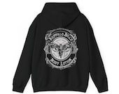 Shipping came fast, I love the fit of the hoodie. It is true to size with room. The inside is not a super fluffy material but still warm but the outside is more durable so good for protecting someone in the cold. The design is so subtle but yet such a morbid inside joke that I love it.