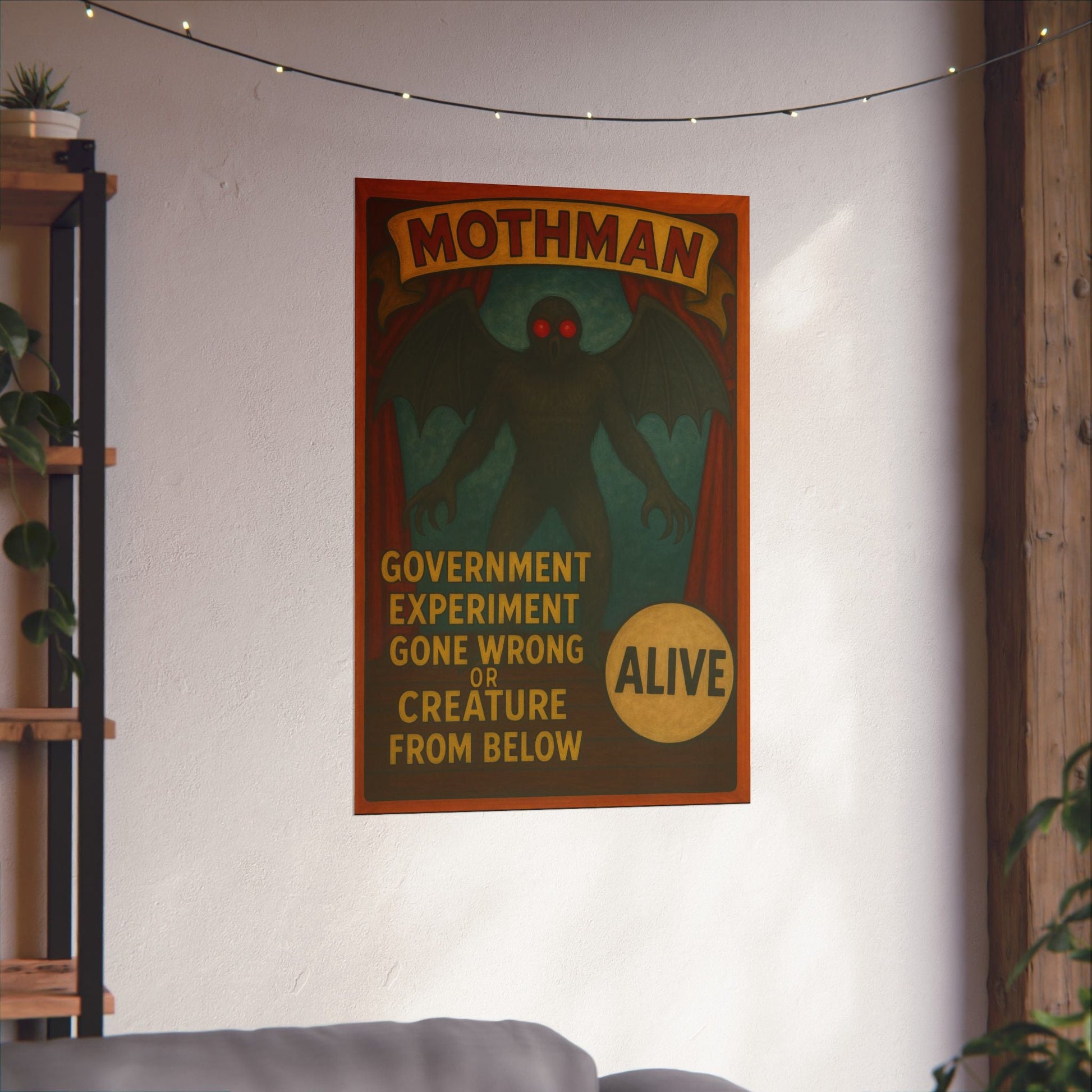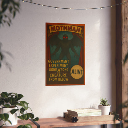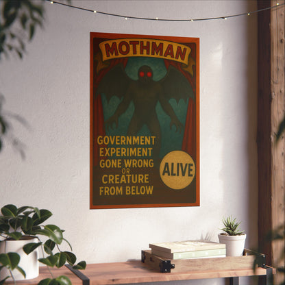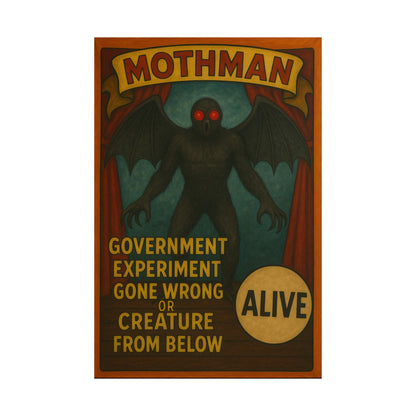 👁️ Step right up for cryptid curiosity with this Mothman Sideshow Poster! Styled like a vintage circus banner, this print questions everything — experiment gone wrong or creature from below? Printed on 175gsm museum-grade matte fine art paper with archival inks, it's perfect for cryptid collectors, carnival lovers, and fans of the mysterious and macabre.